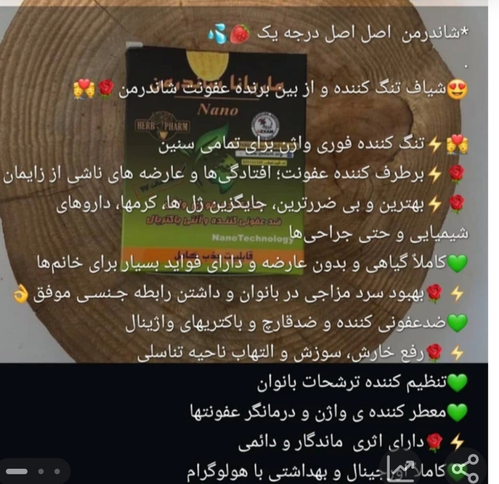 شیاف شاندرمن ماریانا جذبی مزایای شیاف ماریانا جذبی شاندرمن ✅افزایش لذت در حین رابطه ✅درمان عفونت های زنانه ✅رفع خارش واژن ✅تنگ کردن فوری واژن ✅درمان بوی بد واژن ✅متعادل نمودن PHترشحات زنانه ✅ اورجینال