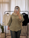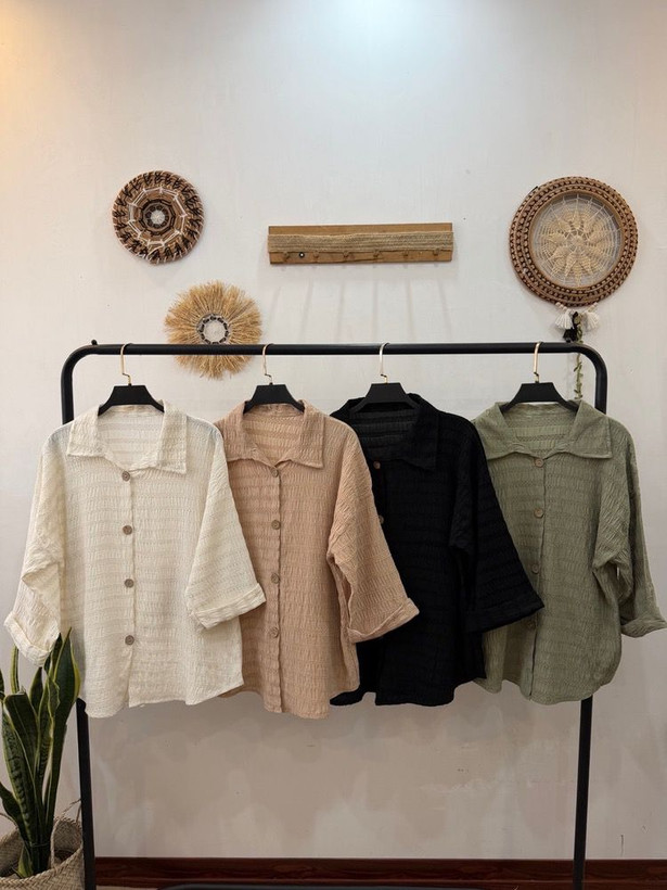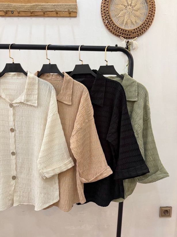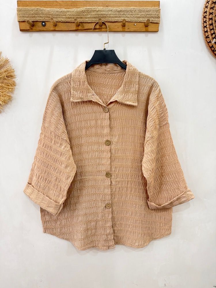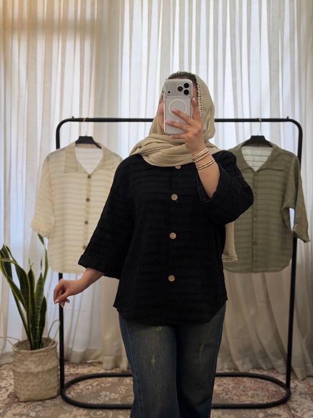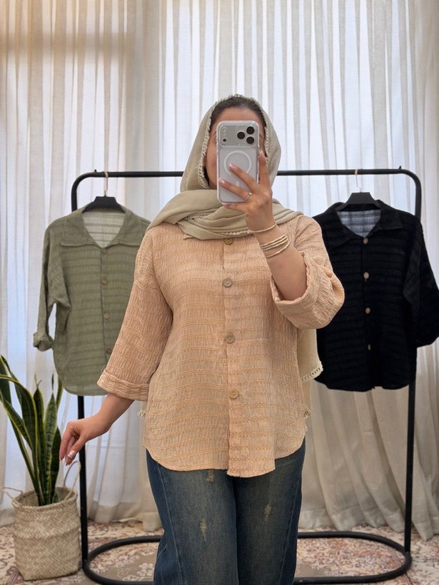 🔹شومیز باکسی آستین پاکتی دکمه چوبی